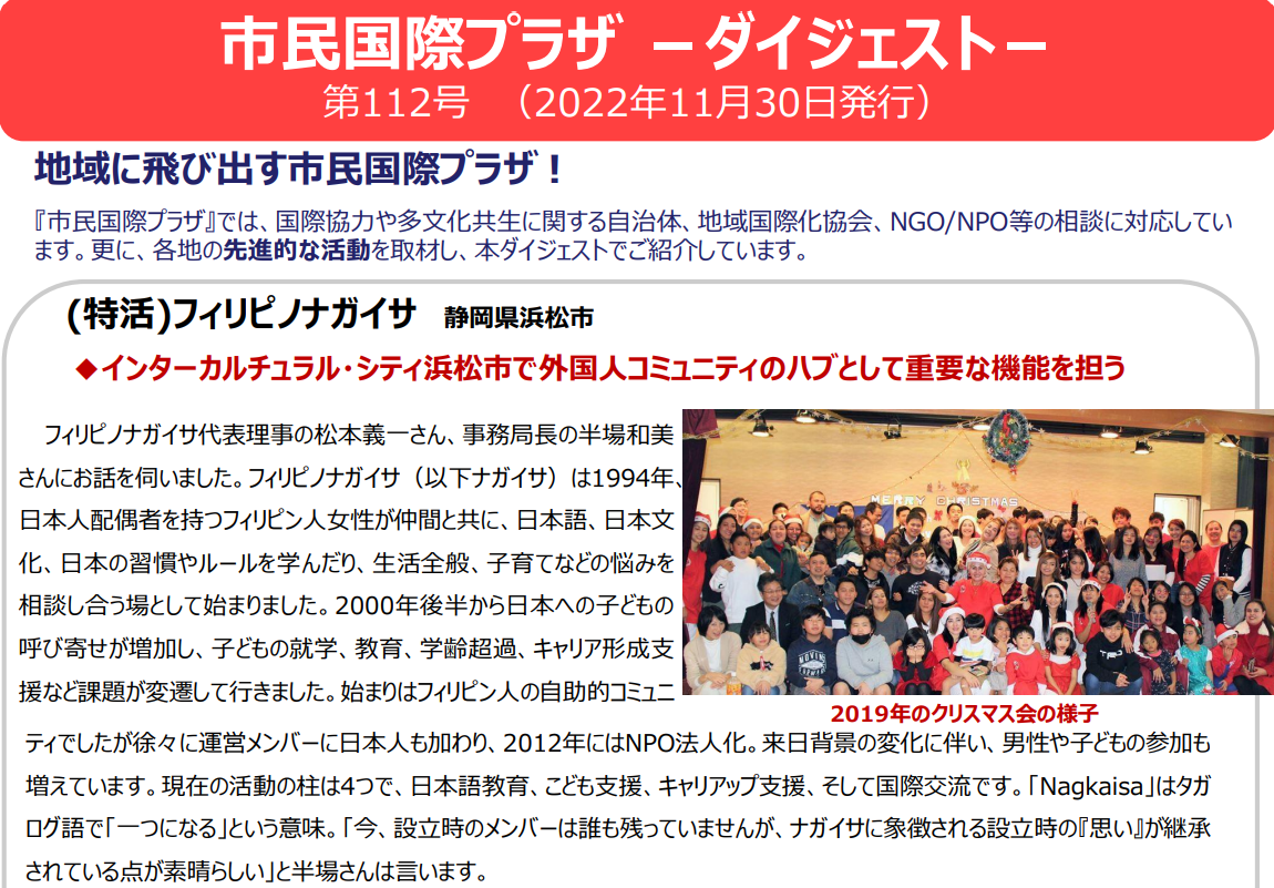 一般財団法人自治体国際化協会・市民国際プラザ(CLAIR・クレア)の、「市民国際プラザ ダイジェスト112号」に、当法人の取組が掲載されました。